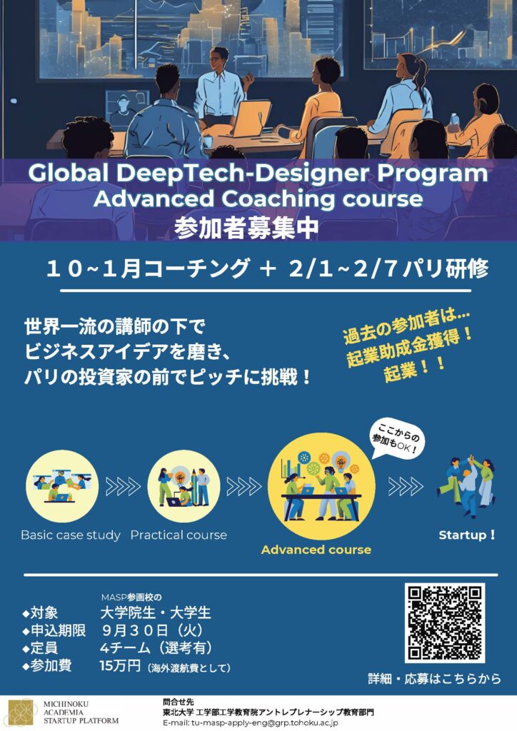 Global DeepTech-Desinger Program: Advancedコース(みちのくアカデミア発スタートアップ共創プラットフォーム(MASP) 〆切2025/10/3)