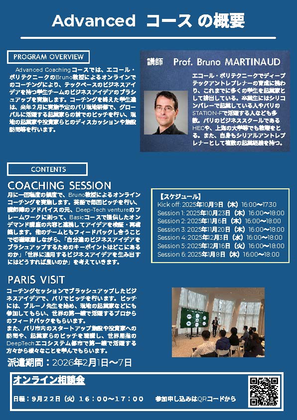既に自分達のビジネスアイデアを持っている、ビジコンに出場したことがある、あるいはもう起業している、といった学生や研究者向けに、自分たちのビジネスアイデアをブラシュアップするコーチングを実施する中・上級者向けのコースです。3カ月間のオンラインコーチングと、2026年2月のパリでの現地研修プログラムを通じて、自分達のビジネスアイデアを一段上のレベルへ押し上げます。